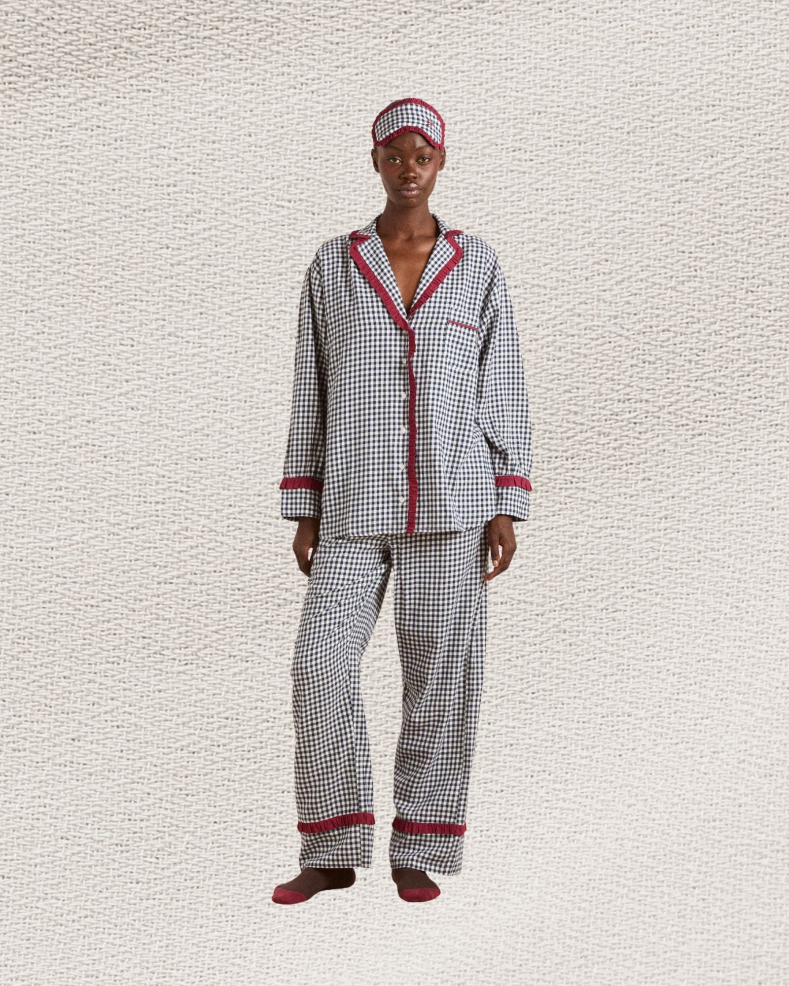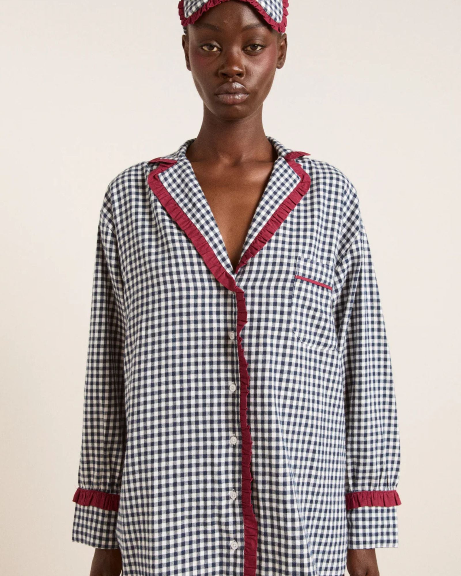 Our Antonia pyjama set in gingham returns, now in navy with burgundy trims. Made from 100% organic cotton, offering m...