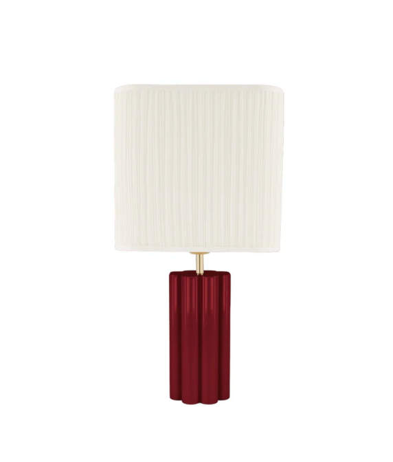 Small pleated cotton and burgundy lacquered wood table lamp.